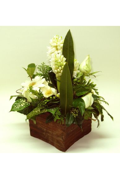 Ανθοσύνθεση σε χειροποίητο κεραμικό κύβο στο χρώμα του ξύλου.