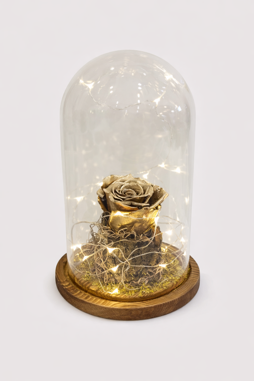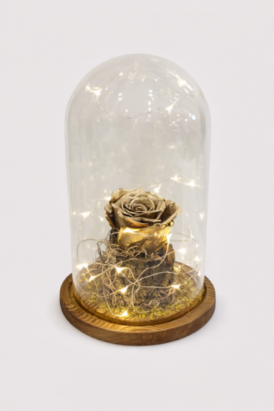 Χρυσό τριαντάφυλλο αποχυμωμένο (διαρκεί 3-5 έτη) σε μεγάλη γυάλινη καμπάνα με led φωτισμό.