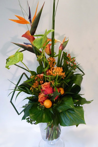 Τροπικά λουλούδια με ζεστά χρώματα σε ανθοδέσμη που εντυπωσιάζει με στερλίτσιες, ανθούρια, μάνγκο κάλλες, τριαντάφυλλα, υπέρικουμ και μπαμπού.