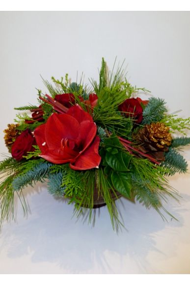 Χριστουγεννιάτικη σύνθεση με κόκκινα τριαντάφυλλα και αμαρυλλίς