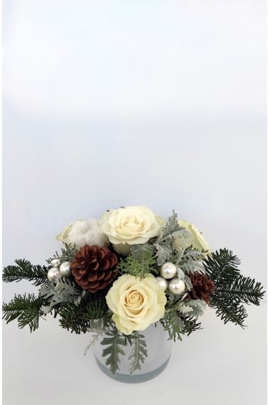 Χριστουγεννιάτικη σύνθεση με βάση το λευκό χρώμα, σε γυάλινο κύλινδρο.